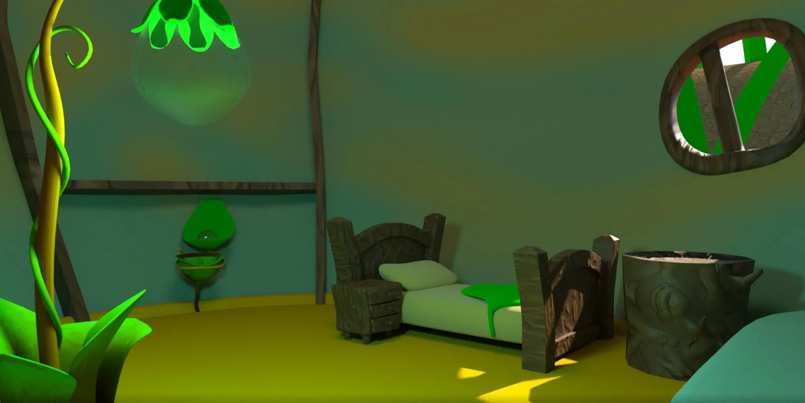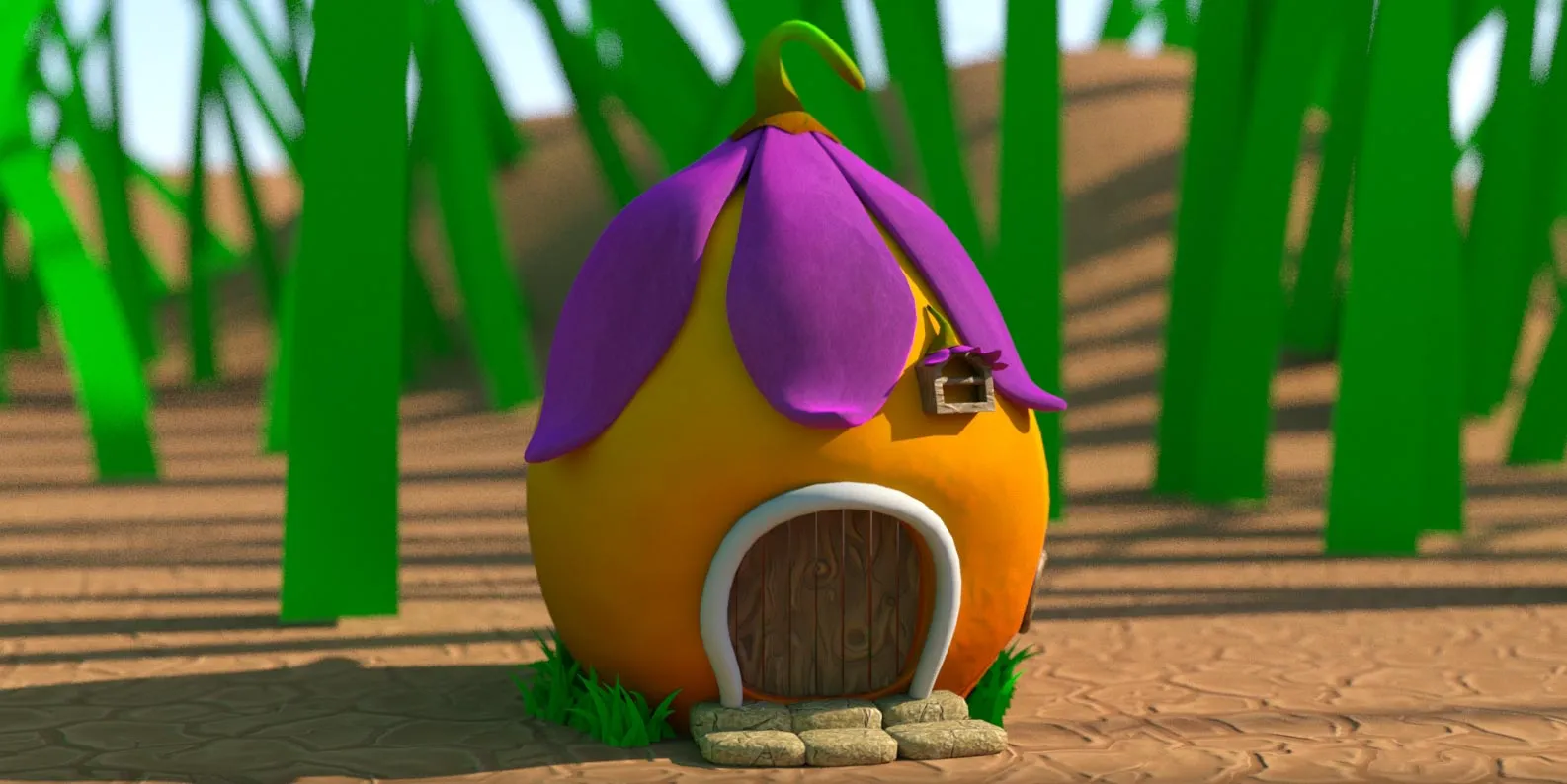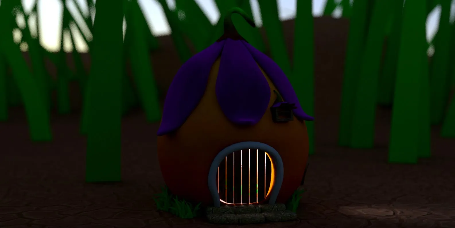 Narıncı yumru forma üzərində bənövşəyi güllə dam, taxta qapı və pəncərə detalları ilə klassik nağıl evi estetikası yaradılıb. İnteryer səhnəsində ağac kötük mebel, yaşıl bitki elementləri və işıqlandırma ilə rahat və səmimi atmosfer təqdim olunur. Həm xarici həm də daxili görünüşlər tam işlənmiş və render edilib.
